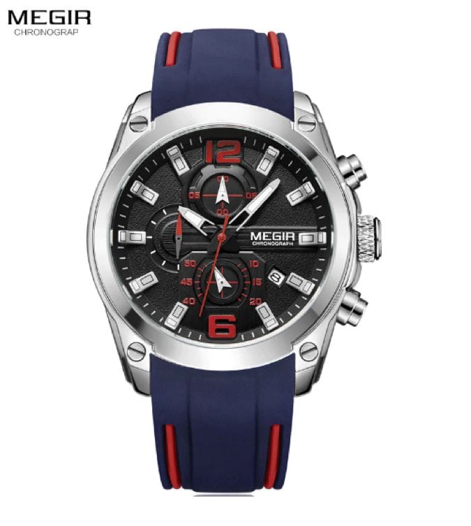 This is my favorite go to watch. I got this about a year ago, still going solid. It features auto date with complete calendar, a working chronograph and luminous hands and indexes. It features a gorgeous black dial with red and white color which is protected by hardlex window. Case is made of alloy. It comes with a blue color rubber band with red borders. The watch feels great on the wrist. Carrying a 3bar water resistant rating, this watch can be used while washing hands or in rain. I highly recommend this watch by Megir.