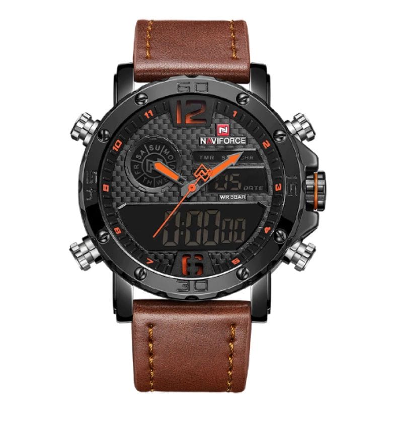 Another good quality and reliable casual watch on the list which has a levitation inspired design. It is both an analog watch and digital built into one. It features digital stop watch, alarm, date, day, luminous hands and dual time. According to the company, case is made from stainless steel which is doubtful at this price point. Watch dial and digital screen is protected by hardlex window. Below model comes with a synthetic leather strap that feels nice and speaks quality. The second hand has Naviforce icon at the tail which looks pretty. It is my second favorite watch that I enjoy wearing to casual events and get togethers.